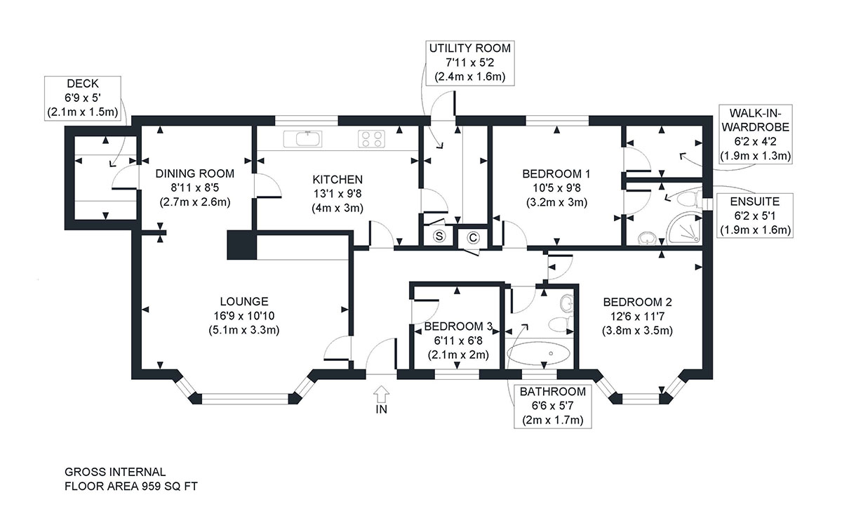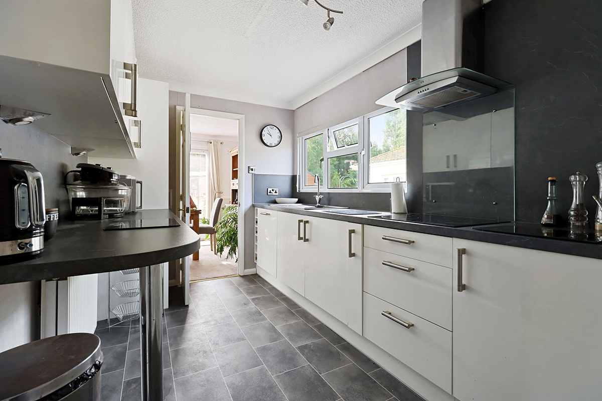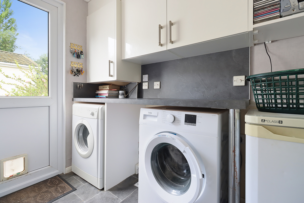 The spacious interior includes a bright lounge and dining area with French doors opening onto a private decking space. The modern kitchen features a halogen hob, double oven, integrated fridge-freezer and dishwasher, with a separate utility room housing the boiler, extra storage and plumbing for appliances.