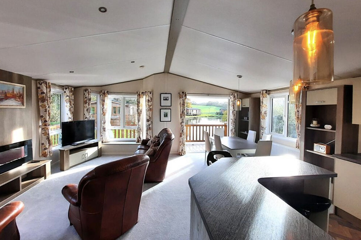 Outside, a private sun terrace enjoys peaceful views across the fishing lake, ideal for relaxing or dining outdoors. The property also benefits from front and side garden areas and driveway parking for two cars.
