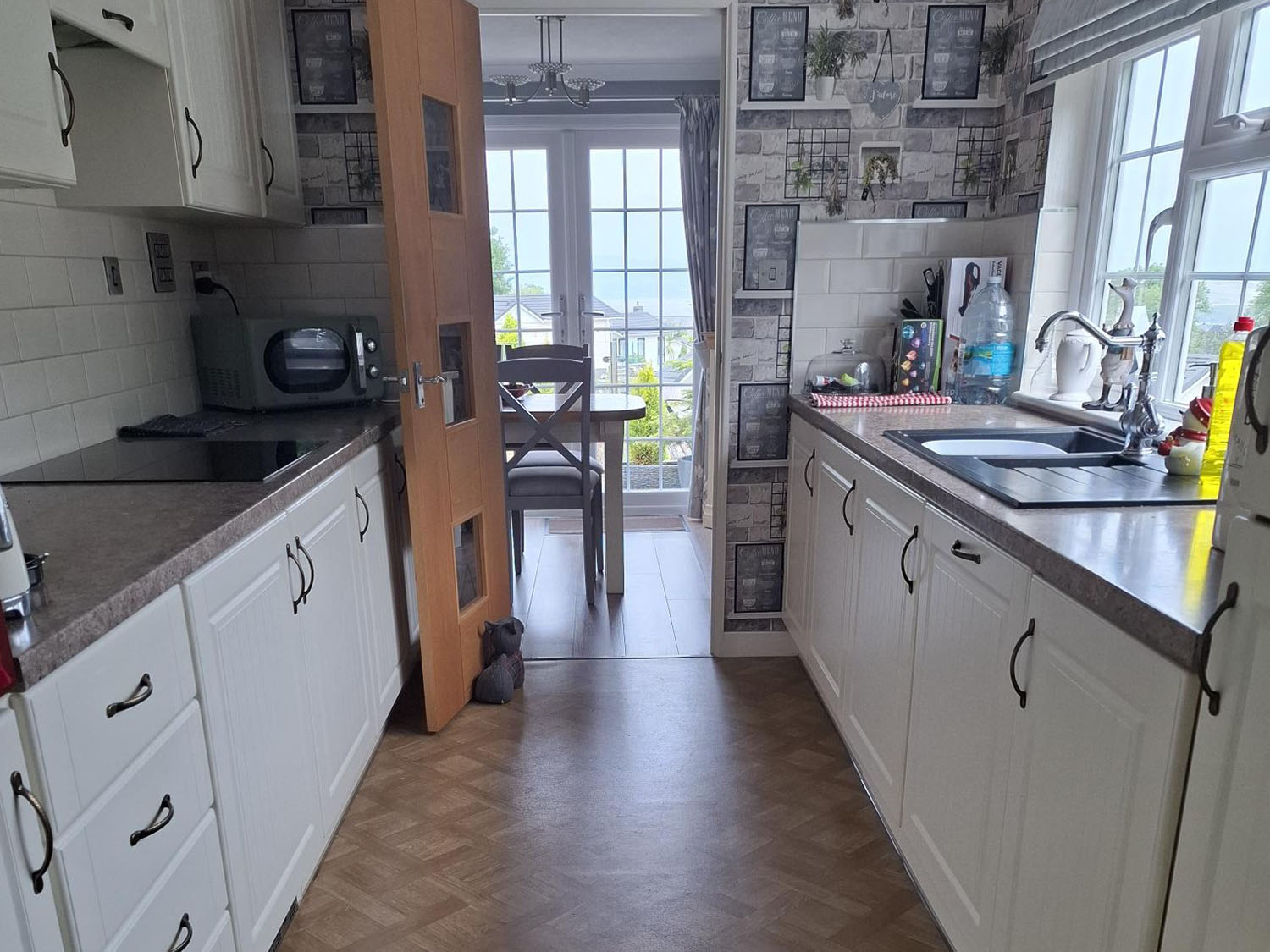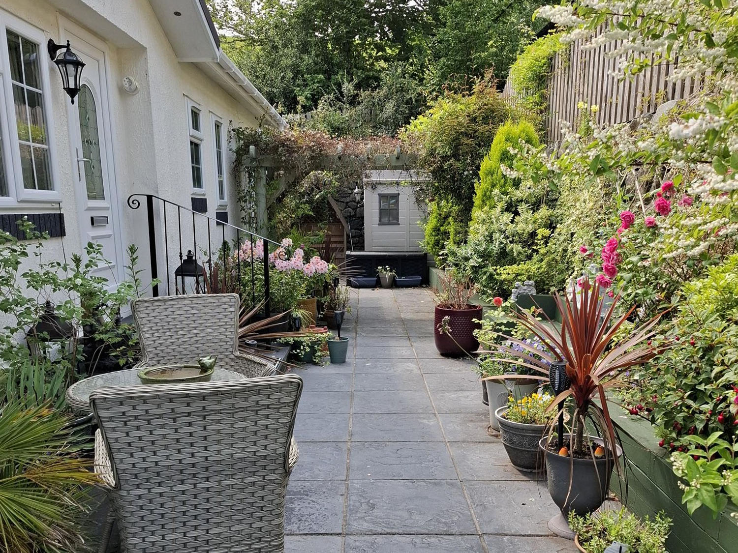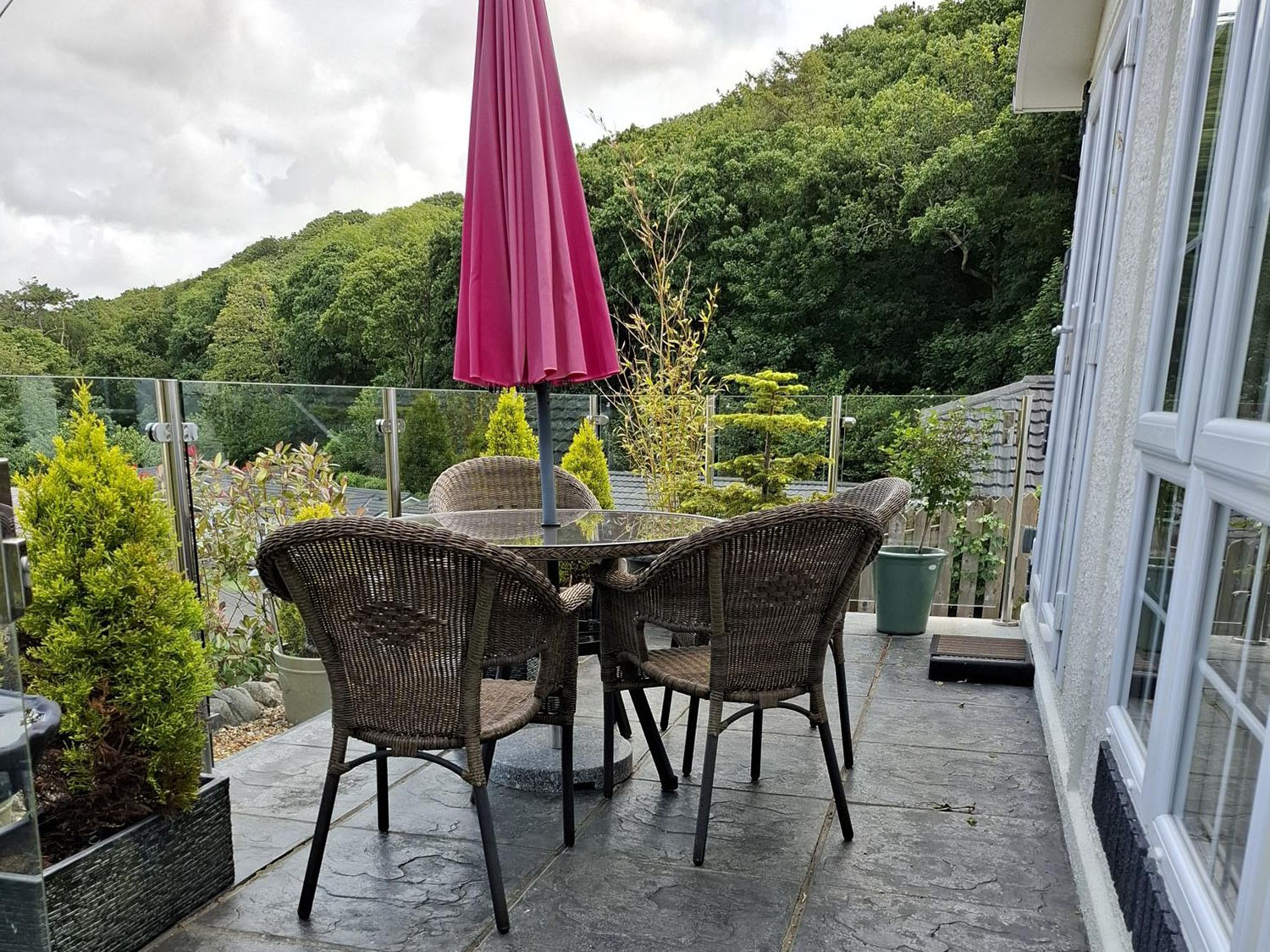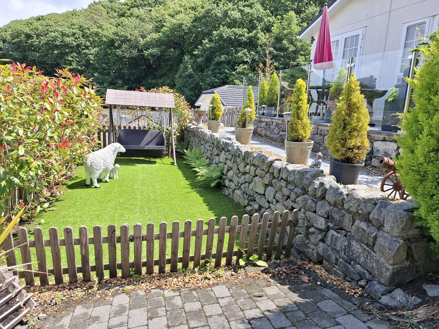 The heart of the home is the open plan living and dining area, where French doors lead directly to the patio – ideal for soaking up the scenery or stepping out for a breath of fresh air. The garden has been thoughtfully landscaped for easy upkeep, with a mix of shrubs and plants adding colour and interest. A lower seating area provides a quiet and private space to relax or entertain, while another tucked-away corner to the side of the home offers yet another peaceful retreat.